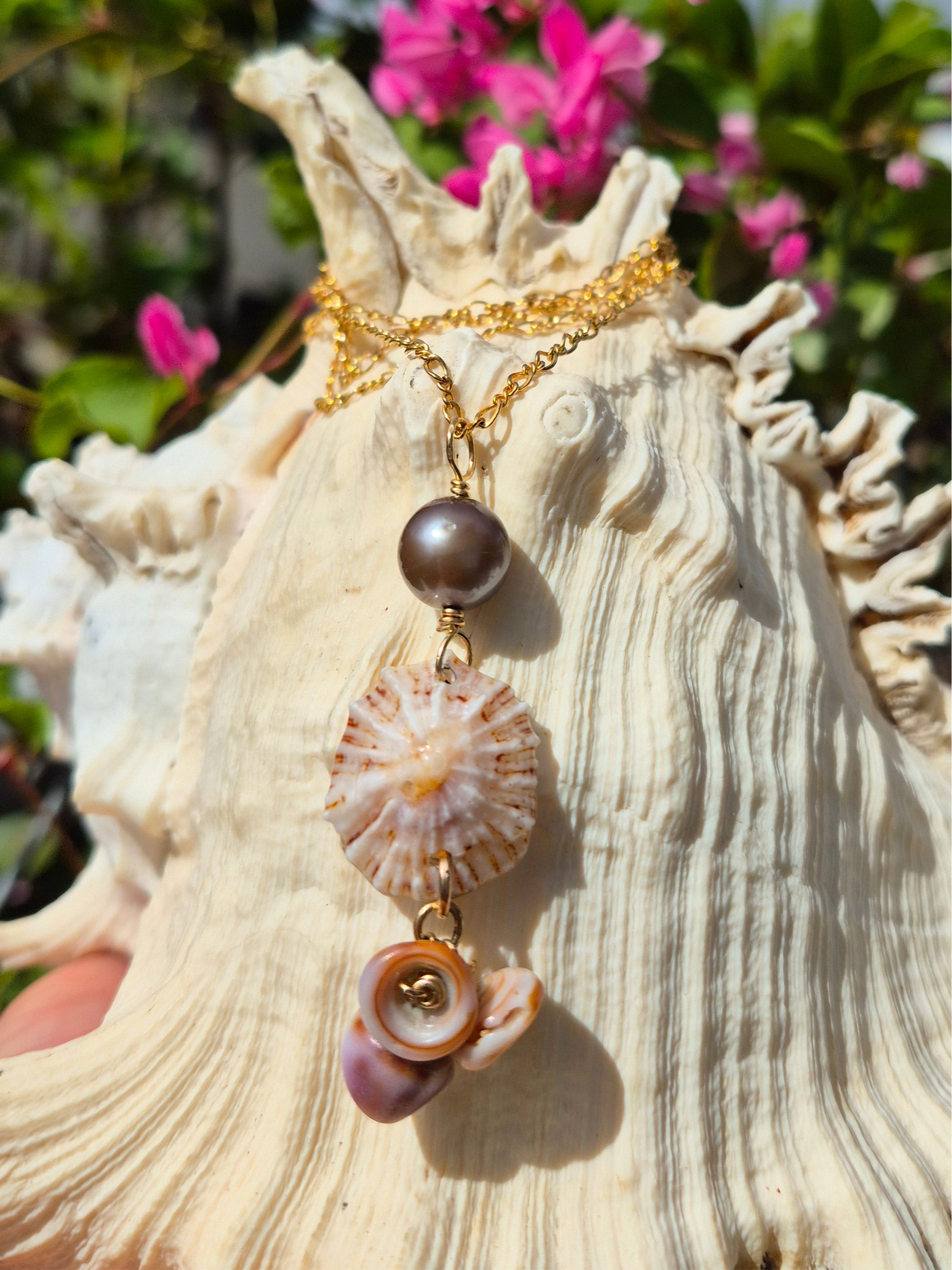 'Opihi 'awa albino shell hand picked from the island of Lāna'i. Adorned with a 8mm matching Tahitian pearl and puka shell chandelier. 14k gold filled 20" inch non tarnish chain. Designed wity intention, designed for you. 🌺