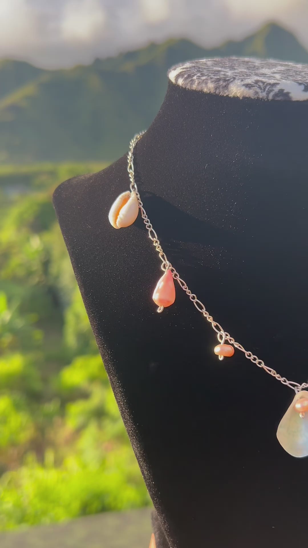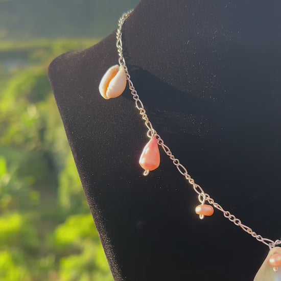 One of a kind natural pearls and seashell charms, handmade and carefully hand drilled to perfection. Each unique shell is strung onto a sterling silver, waterproof chain.